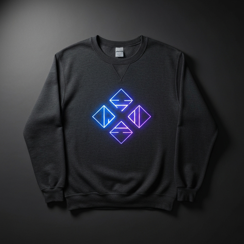 Una felpa scura con un simbolo astratto, luminoso e discreto ispirato al mondo dei videogiochi.